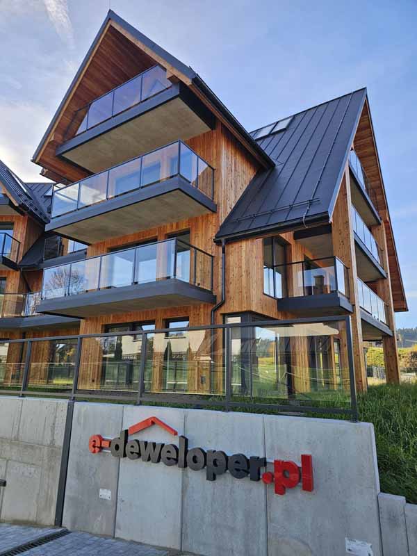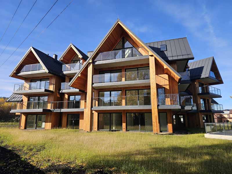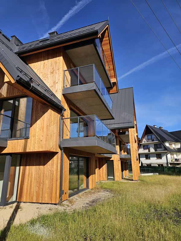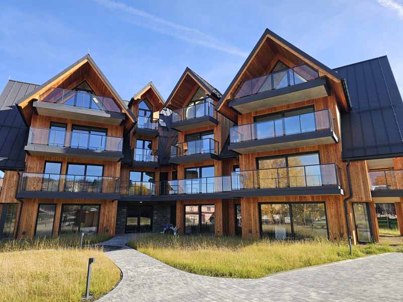 Projekt Tatrzańskiego Resortu łączy tradycyjne motywy podhalańskie z nowoczesnymi trendami alpejskich rezydencji. Elewacja z naturalnego drewna, połączona z dużymi przeszkleniami i elegancką stolarką aluminiową, tworzy unikalny i ekskluzywny charakter całego kompleksu.